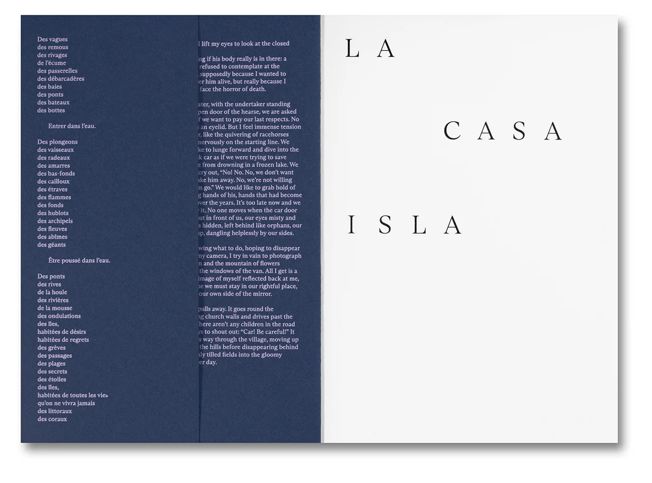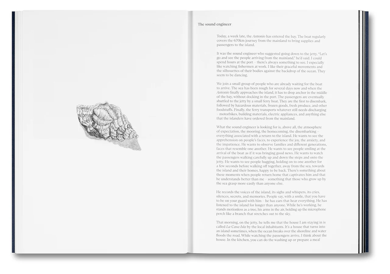 La Casa Isla is an intricate layered work of documentary and fiction by artist Anne Golaz. It is informed by time spent on the island off the coast of Chile that was the inspiration for the place Robinson Crusoe was shipwrecked, which Golaz visited with Stéphane Goël during the production of his 2018 documentary film Insulaire. In this immersive artist’s book, the island is explored as a transitory space of hope and refuge and conversely of isolation and imprisonment. An evocative sequence of image and text places these ideas in contrast as well as resonance. In passages of prose and poetry, the island is laden with promises of solace and transformation, as Golaz’s narrator considers distance, memory, and mortality. Photographs, watercolour illustrations, and pages from the artist’s sketchbook punctuate the narrative, creating a textured and equivocal visual language. Beginning from close, sensory study of a particular place, La Casa Isla grows to form a transcendent meditation on exile and grief, the influence of cinema, and the nature and purpose of art and narrative.