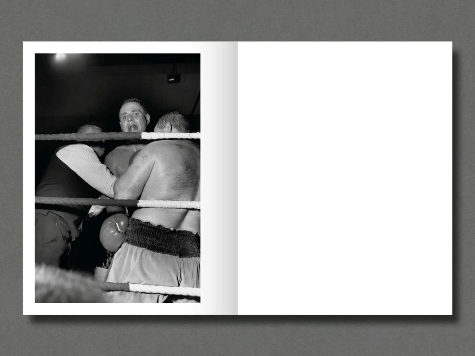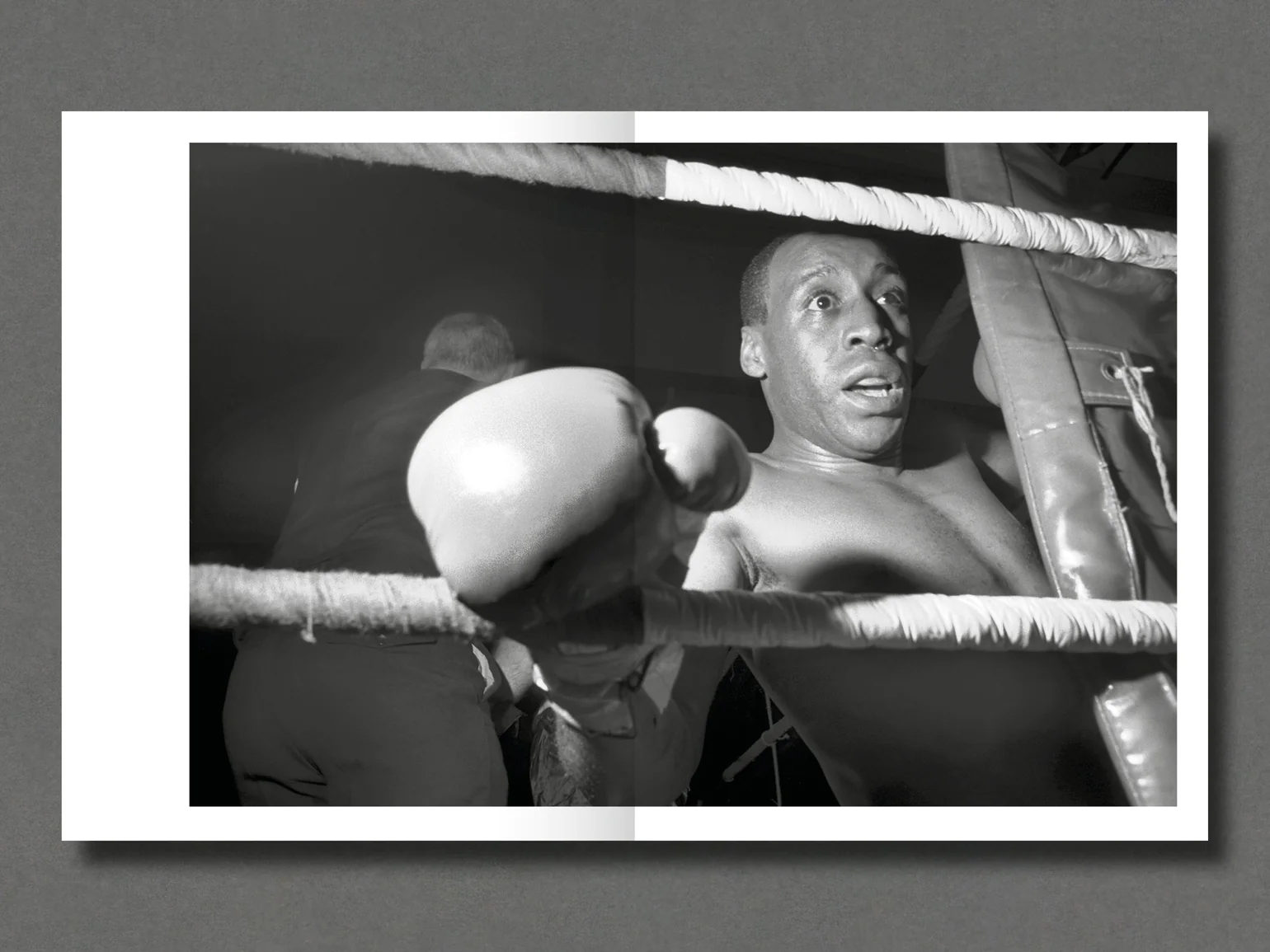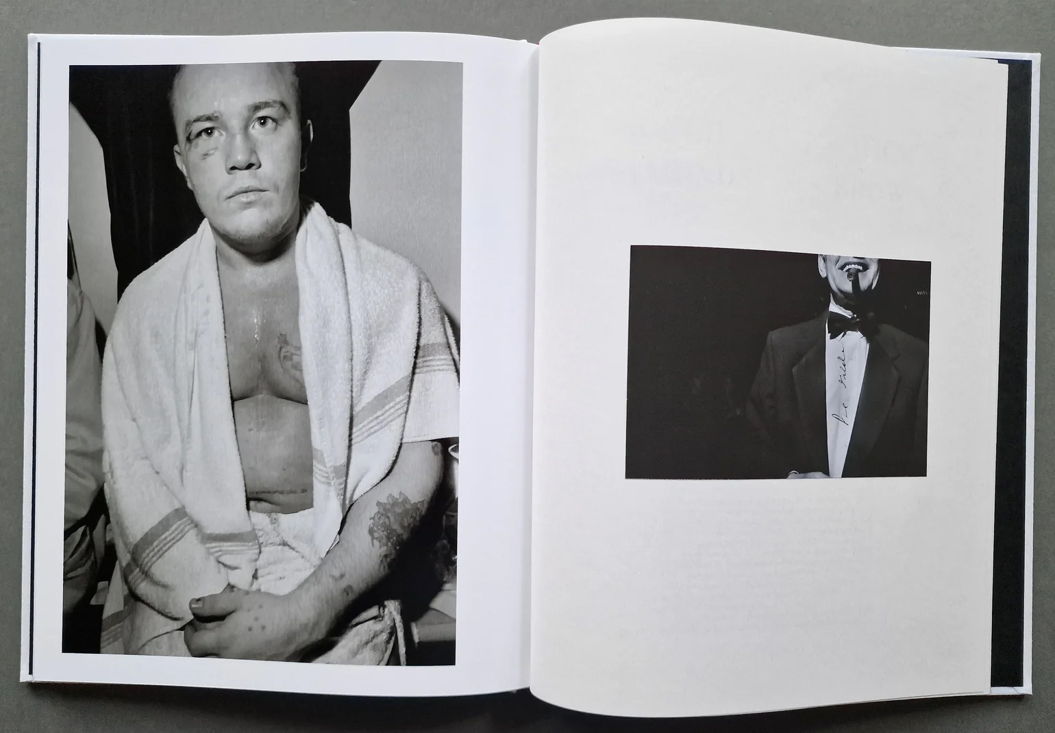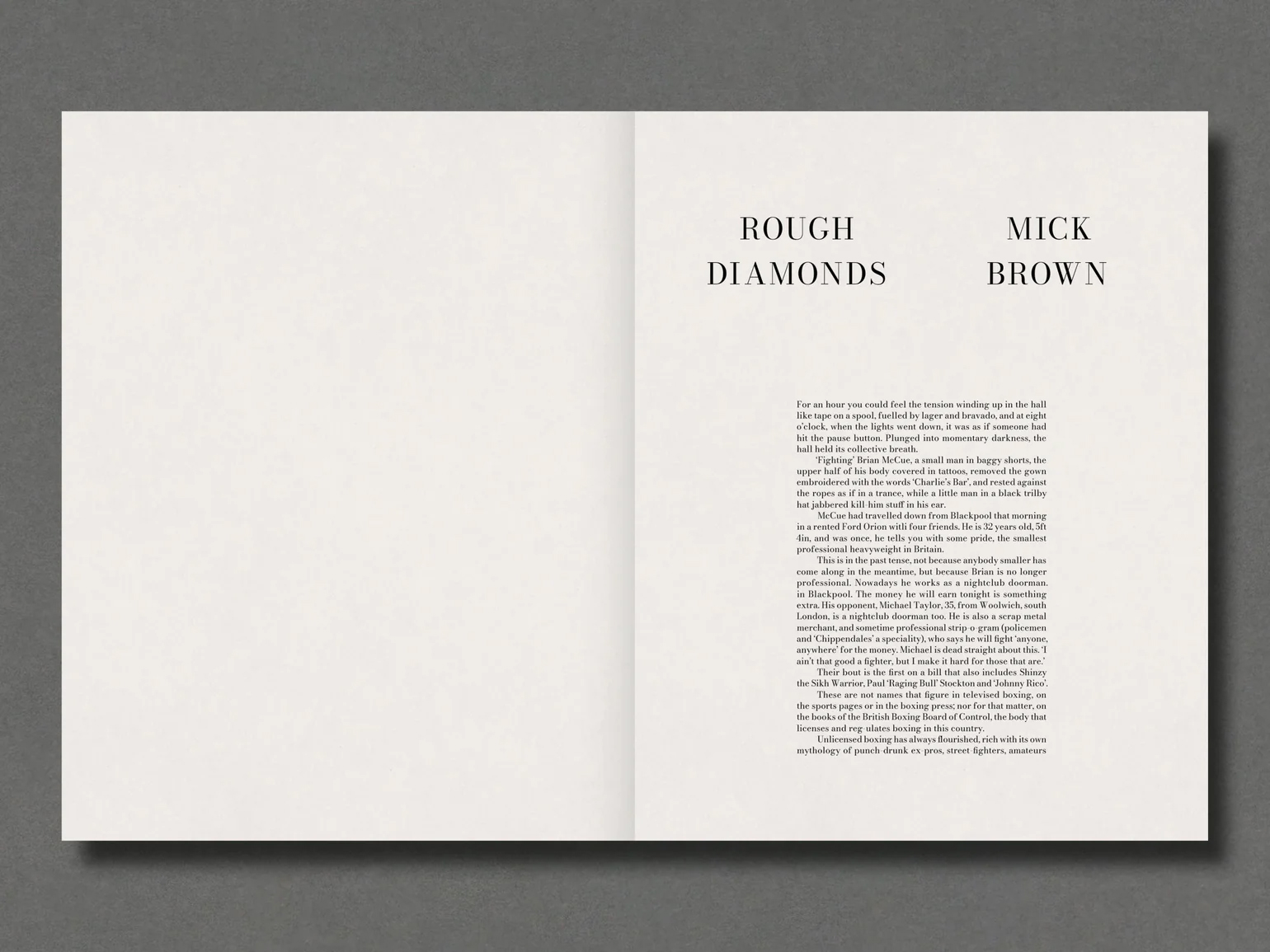 ‘Fighting’ Brian McCue, a small man in baggy shorts, the upper half of his body covered in tattoos, removed the gown embroidered with the words ‘Charlie’s Bar’, and rested against the ropes as if in a trance, while a little man in a black trilby hat jabbered kill-him stuff in his ear.
