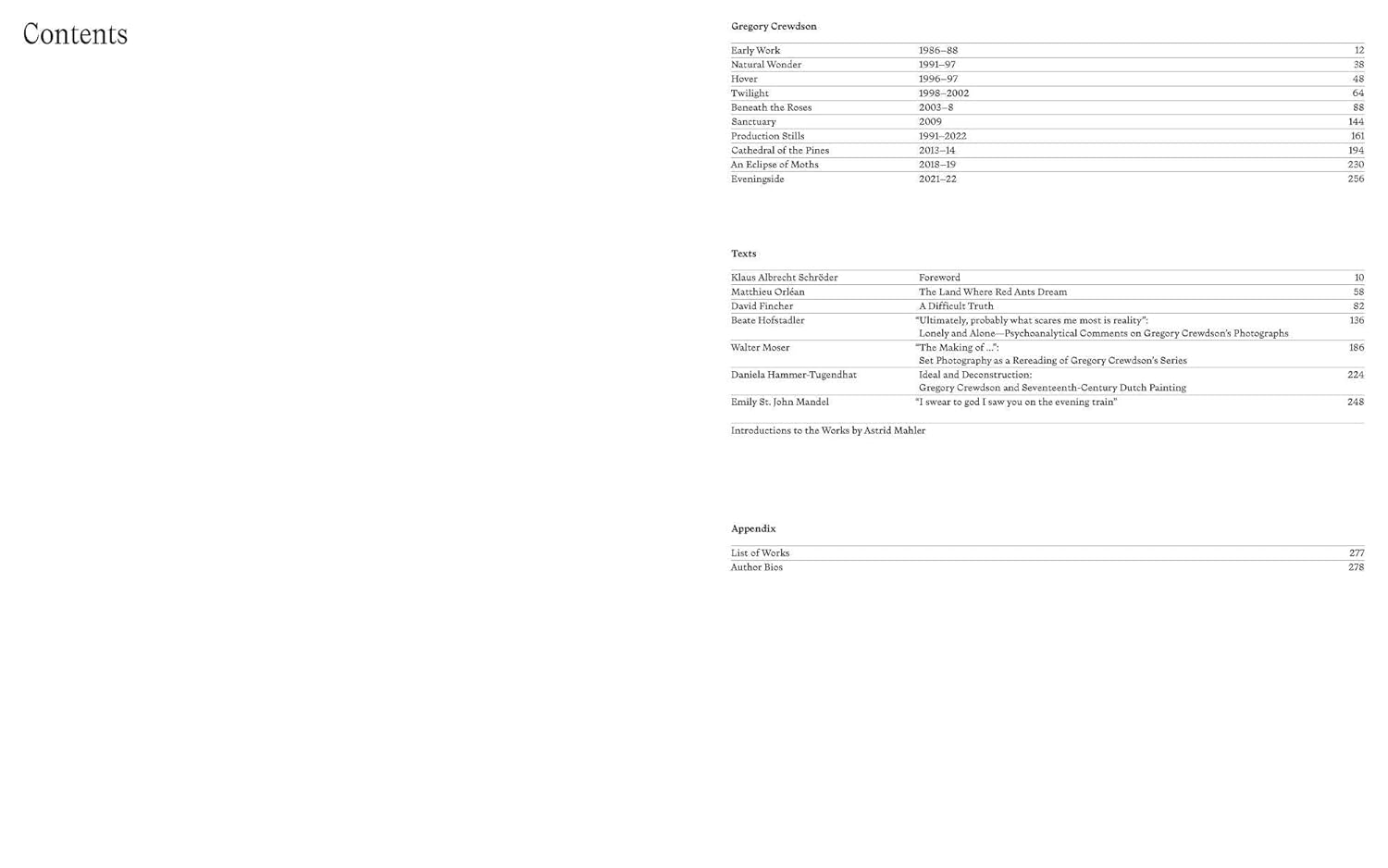 Included are selections from Twilight, the eerie and often darkly humorous photographs inspired by Stephen Spielberg’s Close Encounters of the Third Kind; Beneath the Roses, which illuminates townscapes, forest clearings and broad, desolate streets with unsettling clarity; the black and white images of Sanctuary, shot on location at the legendary Cinecittà studios on the outskirts of Rome; Cathedral of the Pines, a paean to the beauty and tragedy of a gritty western Massachusetts town; and Eveningside, in which moments of alienation and wonder occur within the confines of quotidian life. With highest quality reproductions, paper changes, and incisive essays by photography expert Walter Moser and other esteemed art historians, this exhibition catalog reveals why Crewdson’s powerful, elegiac and painterly photos draw comparisons to old master painting, staged photography and auteur cinema.