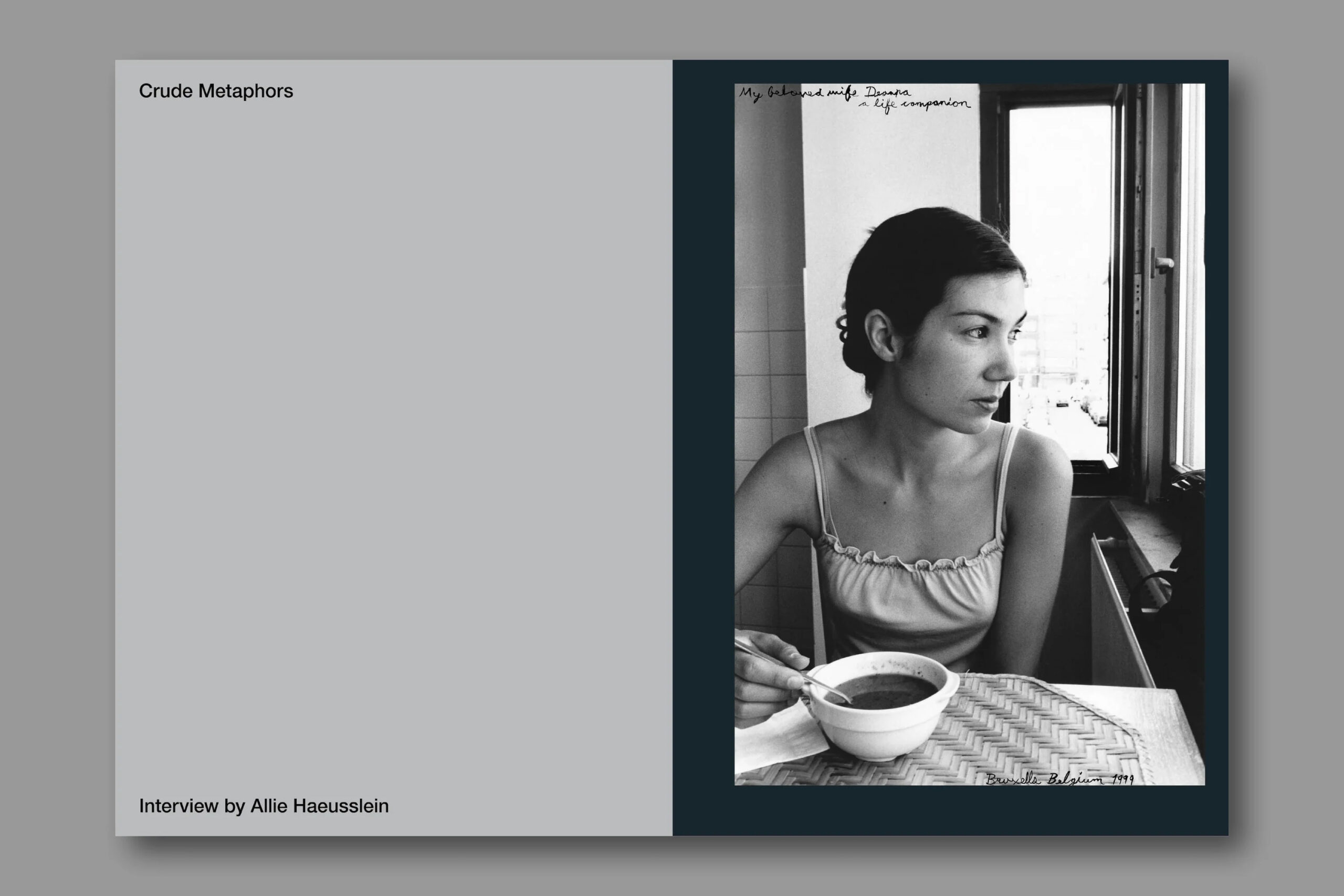 Featuring interviews with Allie Haeusslein, director of Pier 24 Photography in San Francisco, in which they each discuss their own work as well as working together separately. For Crude Metaphors, a joint interview is juxtaposed alongside photographs the couple have taken of each other. One issue, two covers, both with a beginning but meeting in the middle.