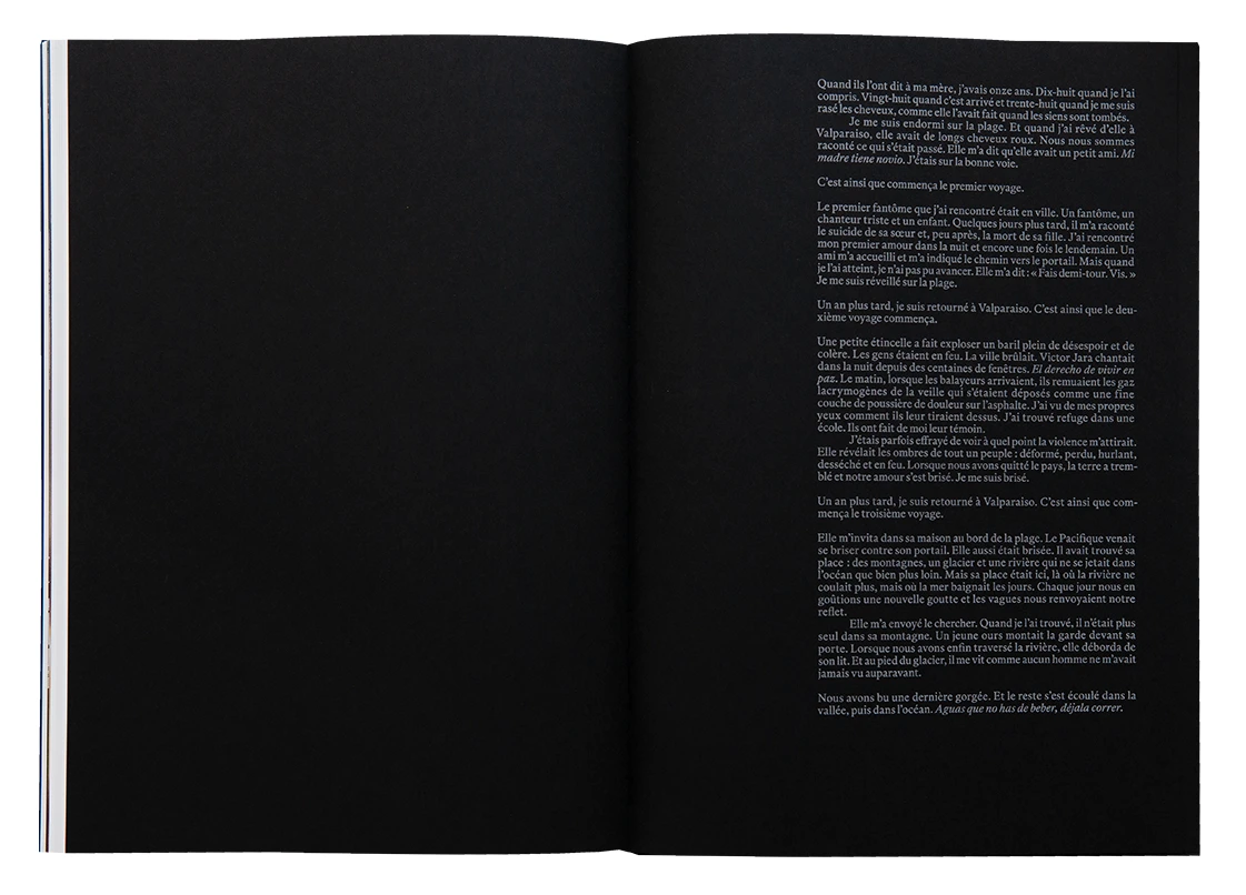 The last series in the book, Aguas Que No Has De Beber (2022), focuses on a woman and a man separated by miles: she is on the Chilean coast, he is in the mountains. This more peaceful series poetically illustrates the power of Chilean nature and the invisible bonds created between two beings. A text by Jörg Brüggemann, translated into French, English, Spanish, and German, accompanies the three series and concludes the book.
