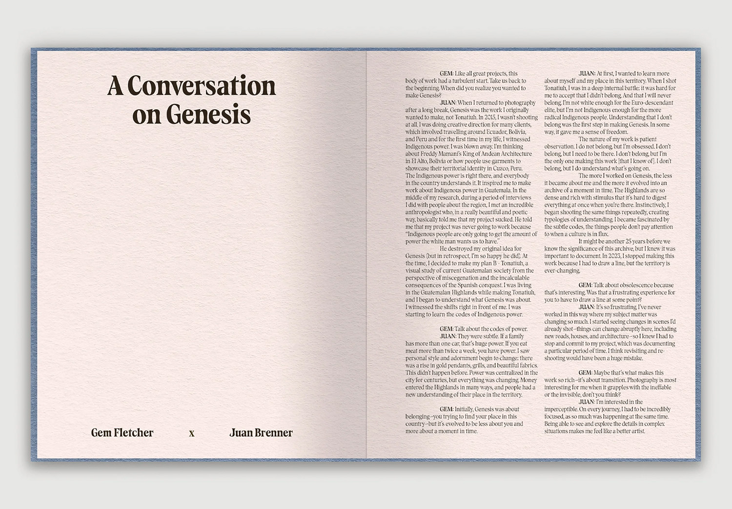 A new book by Juan Brenner that explores the people and culture of the Guatemalan Highlands. Genesis is the culmination of over five years’ work, in which Brenner documented the Highland area and people of his home country. With a focus on youth culture in the region, Brenner captures a new generation of Guatemalans, the first to establish an intelligible dialogue with their contemporaries around the world.