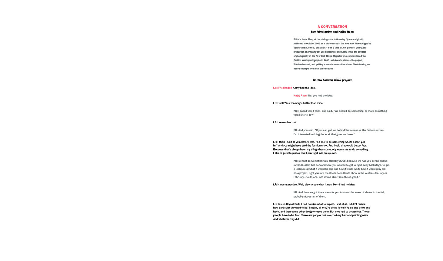 Lee Friedlander (b. 1934) is one of the most renowned photographers of his generation. Through Friedlander’s lens, people in their everyday environments are transformed into arresting portraits, and the banal features of roadsides, storefronts, and city streets become vivid scenery. In Dressing Up, Friedlander ventures into new territory, turning his eye to the rarefied world of fashion and revealing precisely what is commonplace about it: behind the glamorous spectacle of the runway are many people hard at work.