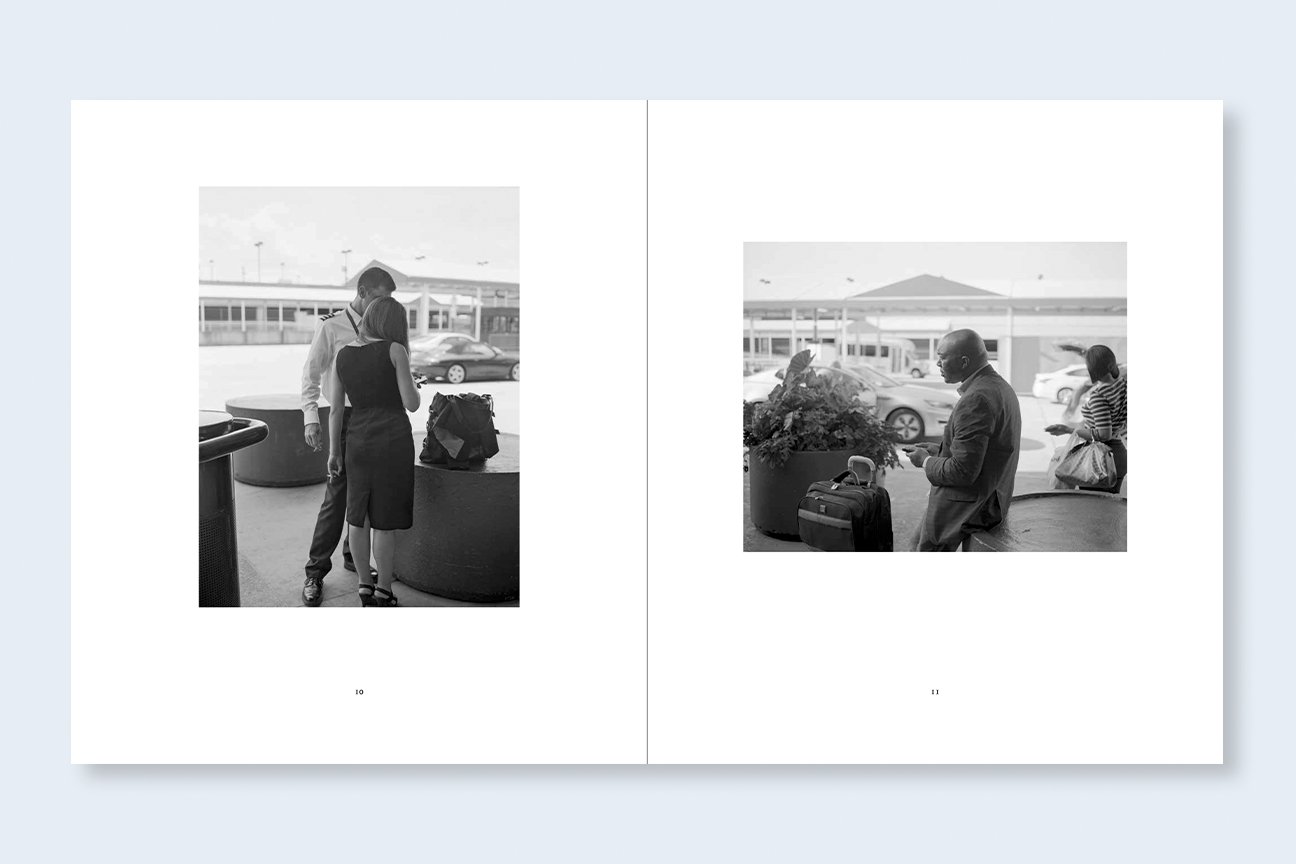 The 64 black-and-white images in ATL emphasize “the quiet transitional moments in this liminal world,” writes curator Gregory J. Harris in the volume’s introduction. Steinmetz captures “the more introspective moments” of travel in and out of the world’s most heavily trafficked airport and includes travelers of all ages “leaving one chapter of their lives and going to another,” as the artist stated in a 2019 interview at the museum. Airline pilots, ground personnel, flight attendants, and janitors are also pictured, always working, often waiting; they share a space with the travelers but remain apart.
