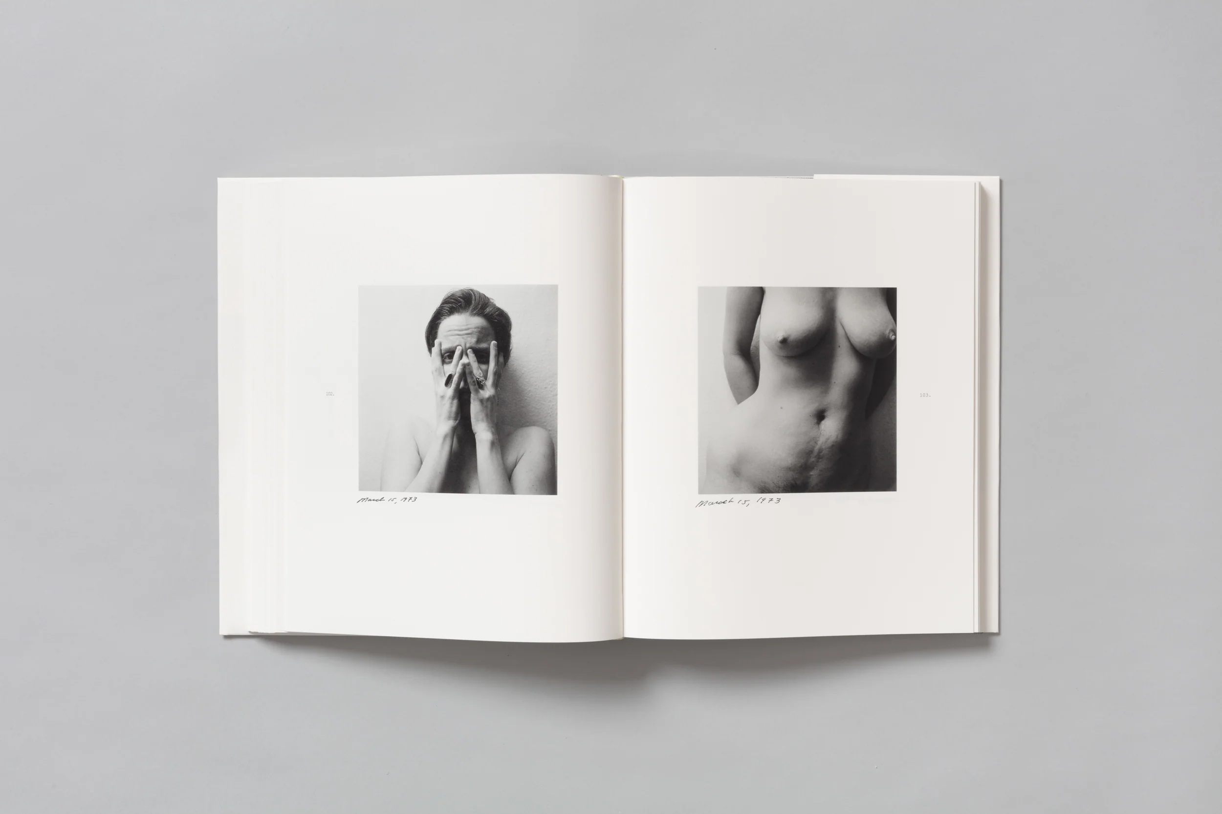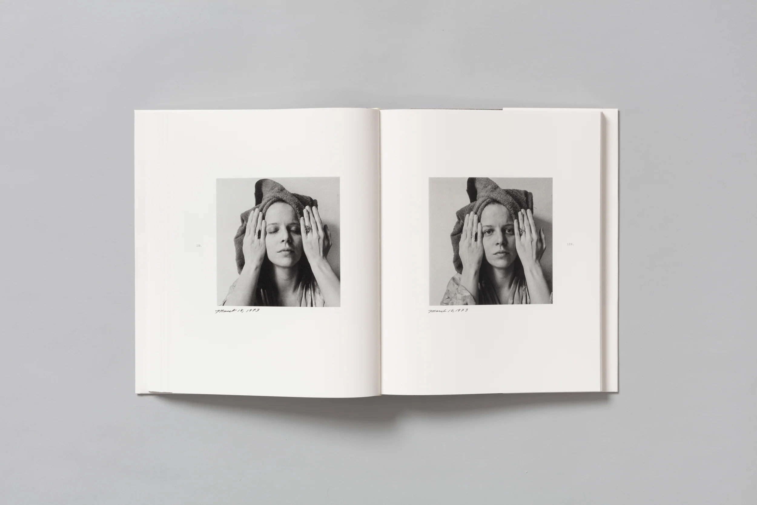 In December 1972, Melissa Shook (1939–2020) began a series of daily self-portraits in her Lower East Side apartment that she would continue until August 1973. Daily Self-Portraits 1972–1973 is the artist’s complete series of 192 photographs published together for the first time. With her medium format, black and white photographs, Shook captures herself in a variety of poses creating a more complete portrait than could be achieved with any one image. The photographs often include Shook’s daughter and the friends who populate her sphere. The viewer is introduced to the artist’s intimate domain and the mundanity of everyday existence comes to the forefront: nursing her ailing toe on the couch, sitting at the kitchen table with a friend, hair wrapped up in a towel post shower, dancing with her daughter. Rather than strictly embodying a typical vision of beauty, Shook’s poses are often imbued with irreverence and parody as a rejection of the tradition of female portraiture made from a male perspective. The book is astutely contextualized by Sally Stein’s essay highlighting the artist’s purposeful dismissal of the idea of a single, revelatory moment, opting instead for the extended serial portrait, with all its contradictions and complexity.