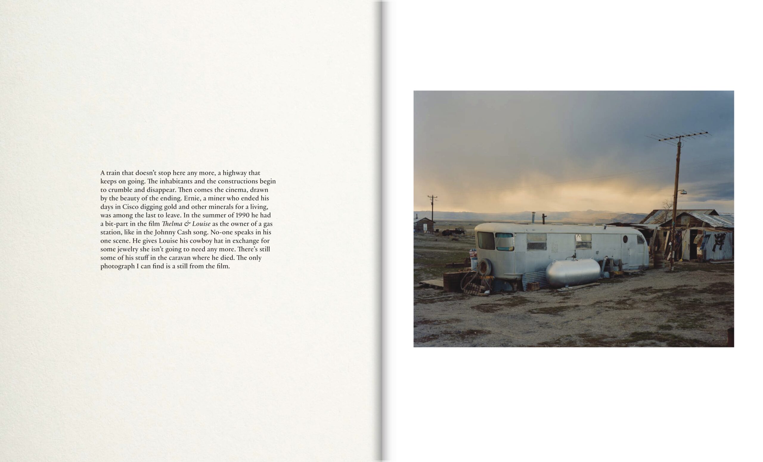 The photographs show us the America battered by the story: a land consumed by its own myth, landscapes that become a chronicle of the power of cinema, images of images that tell us about places that do not matter for what they are, but for what they have represented. Anarene presents a territory full of people and lost and forgotten objects, their stories survive, marginalized, suspended in a time and space that was taken from them. This volume gives value to those fragments found in the ruins of fiction, with the United States used as a background to the stories