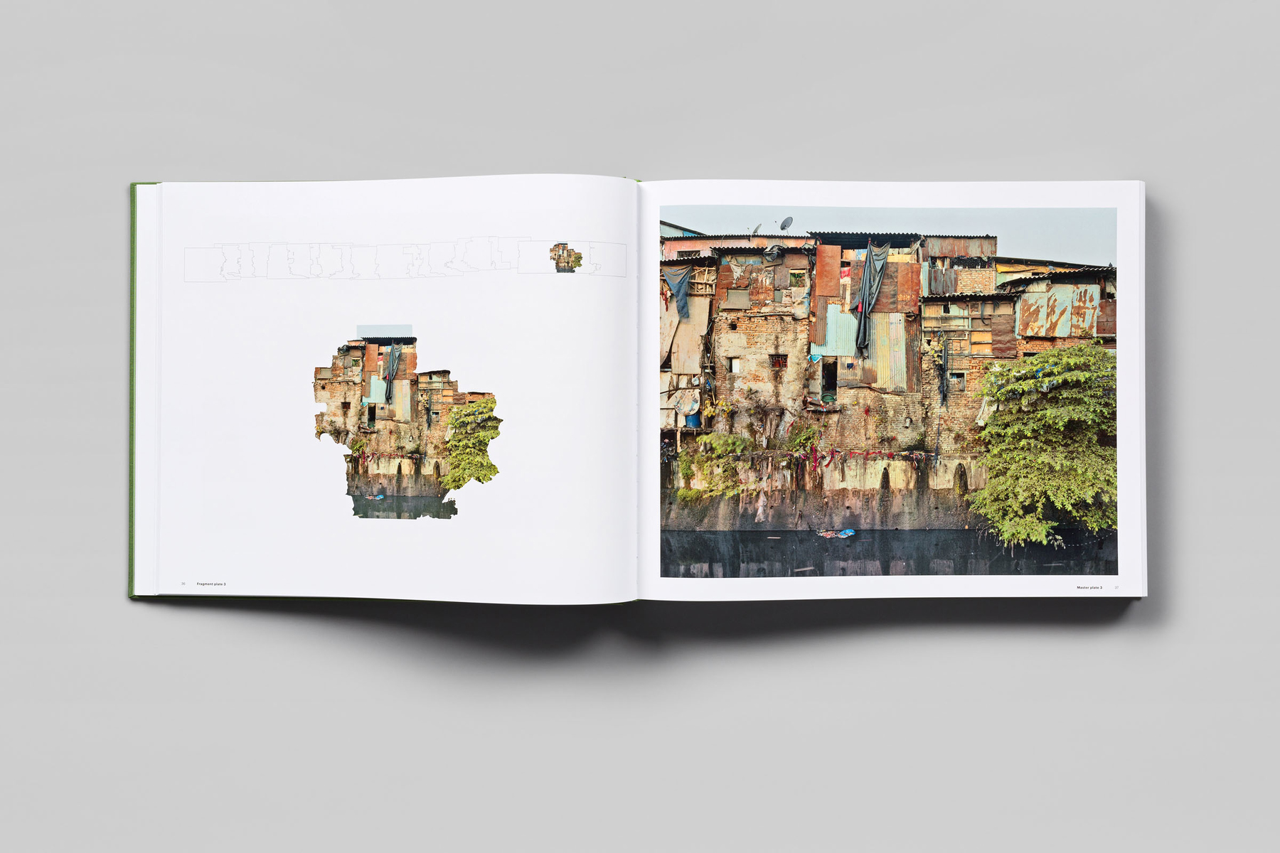 In his new book, Robert Polidori presents us with a single large-format photograph of a city block in an improvised, auto-constructed settlement in Mumbai, India. In an almost seamless déroulement that appears to expand like an accordion or folding-screen, the photograph is composed of multiple images imperceptibly overlaid and welded together in a complex process to form a panoramic view. Applying remote sensing techniques that are normally used in space cartography and street photography, Polidori ventures a photographic attempt to come to terms with the phenomena of adjacencies, observing and beholding what is next to what. In this way he minutely scans the urban landscape, recording the precarious and temporary nature of the provisional and yet psychologically rich and in fact highly individualized dwellings.