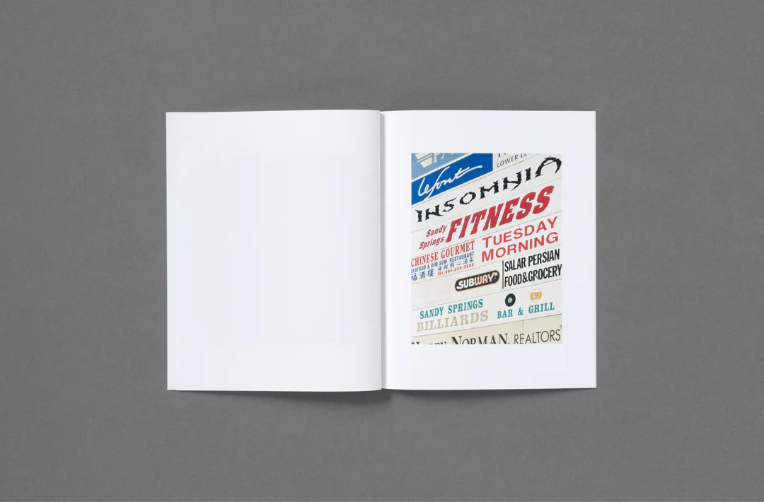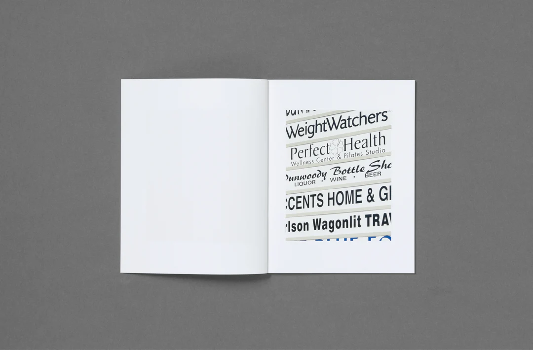 Ethridge’s early books all emerge from loose typologies that, in their slippages, probe and complicate the aesthetics of American visual culture. From 2004, Orange Grove distills photographs made in a dilapidated Florida orchard into a study of slow collapse, a familiar symbol of American plenty quietly withering on the tree. Self-published simultaneously, 2004’s Spare Bedroom begins Ethridge’s career-long practice of jumbling and juxtaposing the commercial and the personal, in which an early commission for a furniture company unravels into a jagged mix of domestic scenes, catalogue imagery and loosely staged interiors. Finally, County Line (2005) turns to the liminal spaces of Queens and Nassau County, abstracting the language of the strip mall into a concrete-poetry of word-photographs that sit against other images evoking the blurry edges of the suburban sprawl.