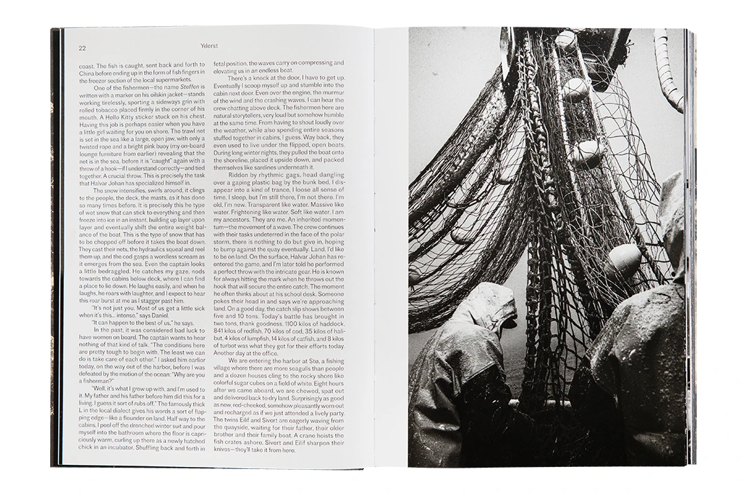 Yderst (“at the edge” in Norwegian) paints a poetic, cultural, and political portrait of the coasts of northern Europe. Designed as an album with double-page images, the book uses pictures and text to explore the permanence of ancestral cultures, discussing ecology, adaptation to the elements and to the times, but also how knowledge is passed down along the coasts, from one country to another.