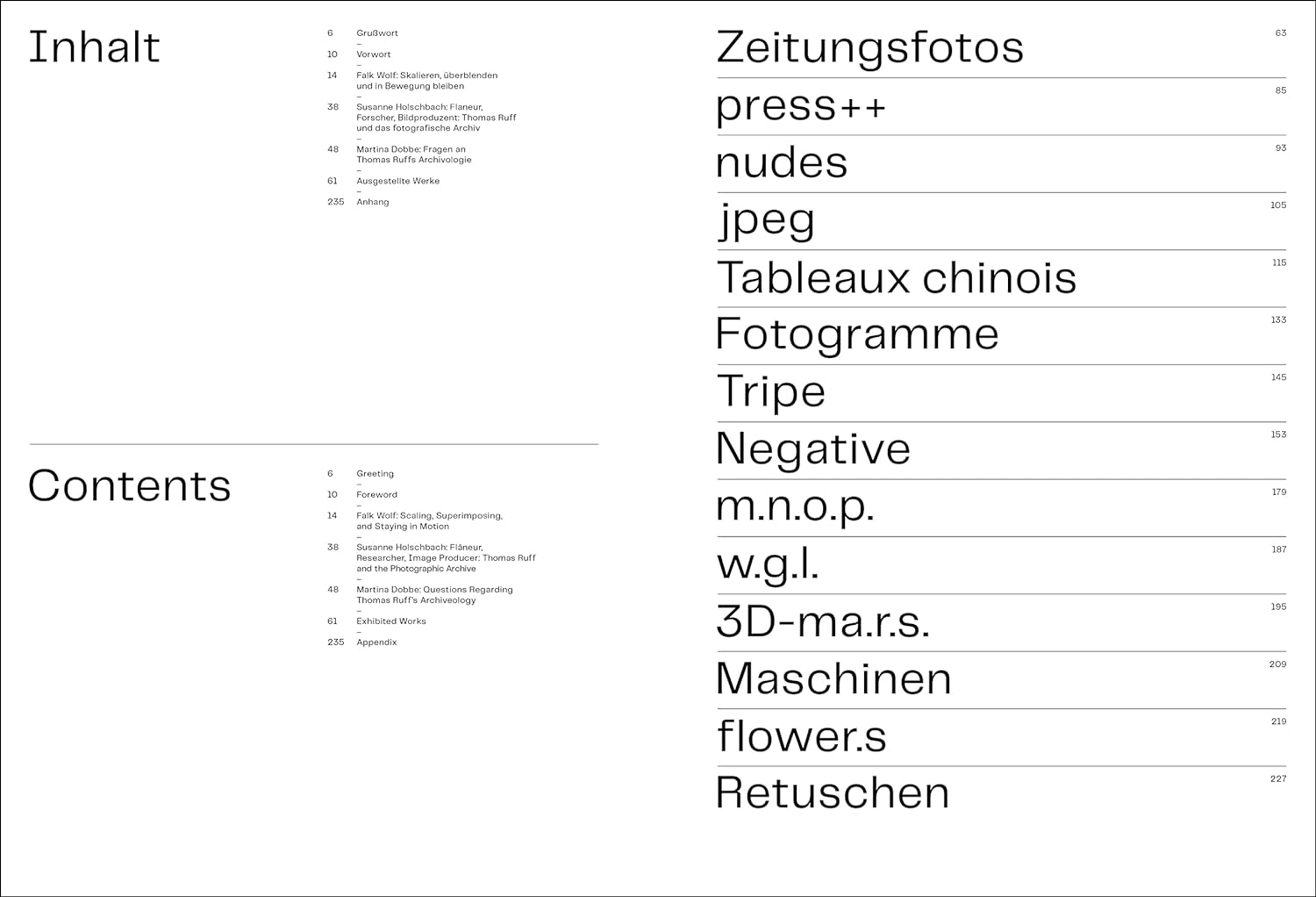 Thomas Ruff is one of the most important contemporary German photographers living today. Studying under Bernd and Hilla Becher, Ruff experimented with large-format printing. This comprehensive book focuses on his photographic series from the past twenty years. These series are based on found photographs from a variety of sources. The source materials range from early nineteenth century photography to machinemade photographs of distant planets, from post-war press photos to propaganda images from the People’s Republic of China, and from Internet pornography to computer generated photograms. In each series, Ruff explores the historical and technical conditions of photography by examining these highly varied pictorial worlds. At the same time, he takes into consideration the afterlife of the images in archives, databases, and on the Internet, thus formulating highly complex perspectives on the photographic medium and the world that has already been photographed.
