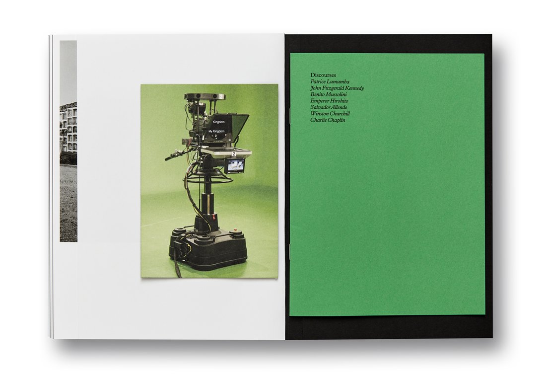 Accompanying My Kingdom is a booklet containing extracts of fervent speeches by political figures including Thatcher, Mussolini, Churchill and Chaplin the Dictator, all proclaiming the authoritarian power of the state over people.